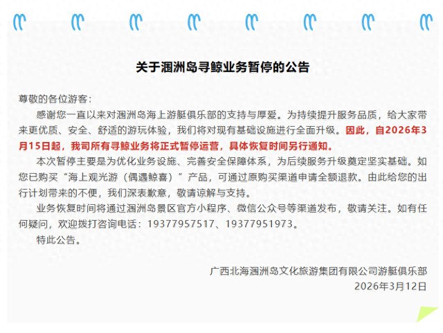 近日,“涠洲岛”微信公众号发布寻鲸业务暂停公告。公告称,3月15日起,涠洲岛所有寻鲸业务正式暂停运营,具体恢复时间另行通知。